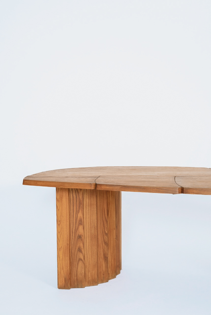 Table ovale permettant d’y installer une ou deux rallonges. L’encombrement maximum étant de 225 cm de longueur.