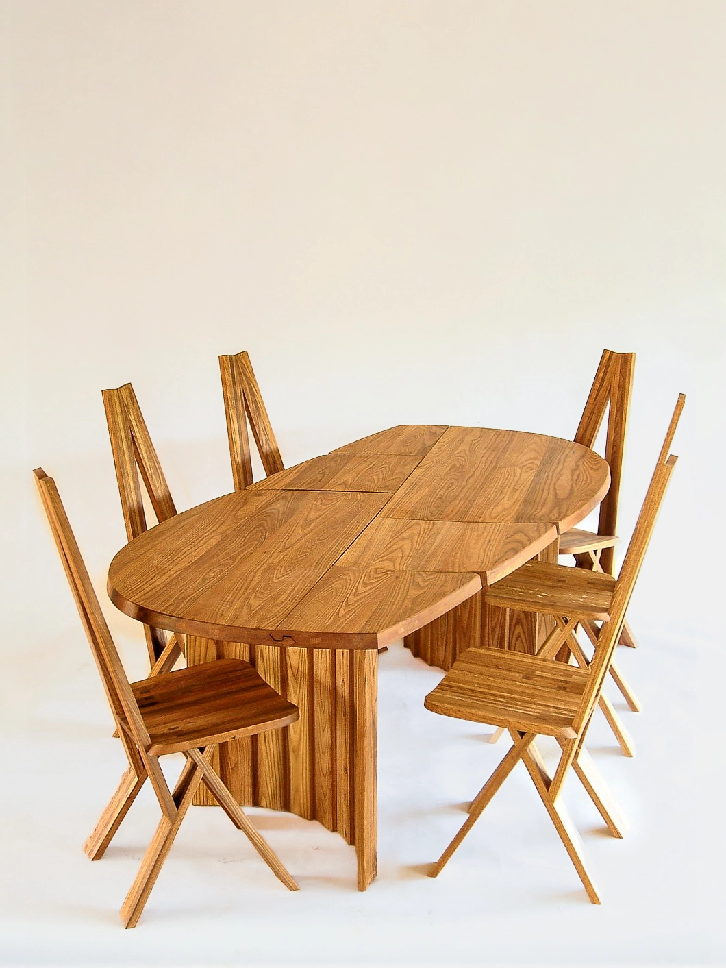 Fruit d’une recherche mathématique patiente et d’un mode de construction navale nordique. Les pieds cylindriques sont un clin d’œil aux magnifique ouvrages, colonnes, coques et fûts, d’un temps oû le bois travaillé en rond n’étonnait personne, et donnait tant de plaisir à ceux qui le maîtrisaient.