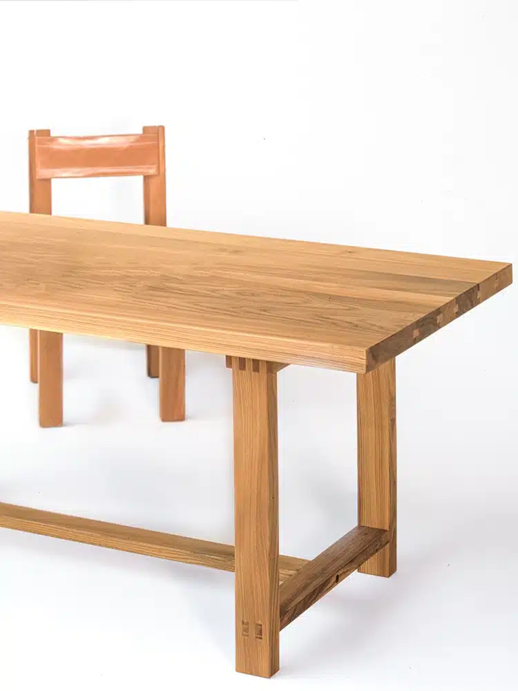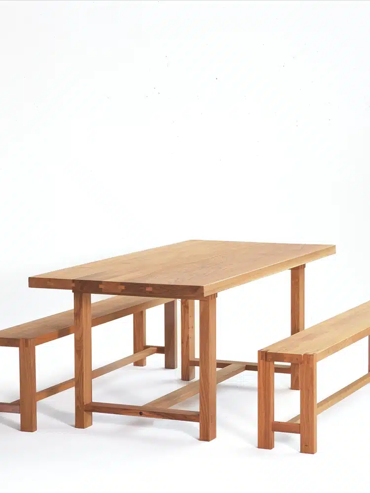 Plateau à bords droits, quatre pieds trois traverses basses, un objet essentiel qui s’intègre à tout lieu et peut subir l’usage le plus intensif, la rallonge D08 ajoute la surface nécessaire à deux convives supplémentaires.