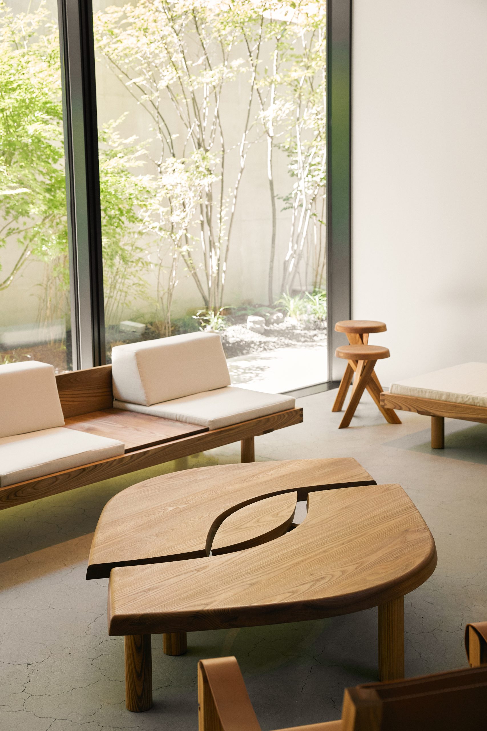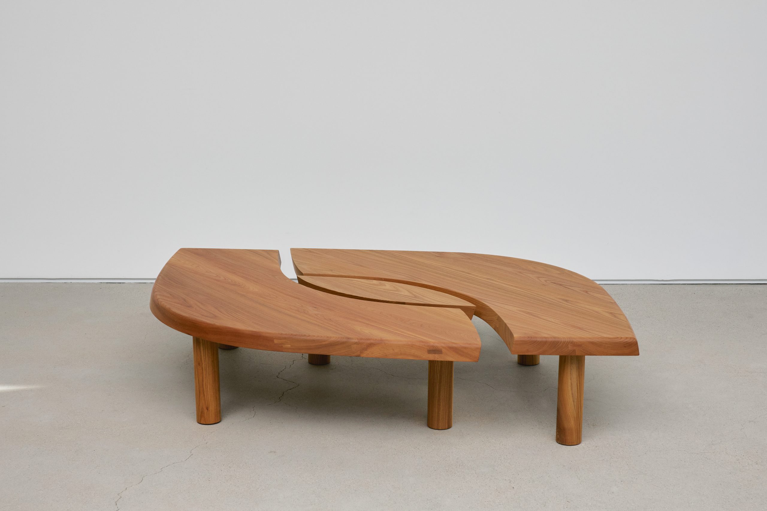 Deux tables identiques, de forme originale, peuvent être jumelées pour constituer une table basses plus importante. Le centre peut être vide ou occupé par un plateau solidaire de l’une des parties. Elles conviennent également bien comme consoles ou petits bureaux avec des pieds haut.